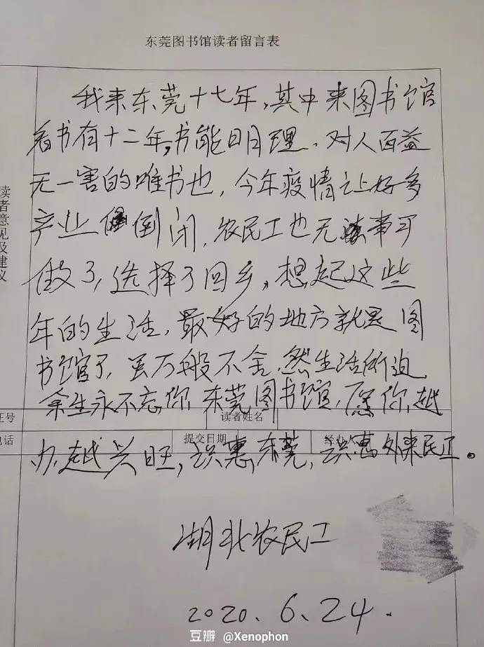 “我來東莞十七年,其中來圖書館看書有十二年。書能明理,對人百益無一害的唯書也。今年疫情讓好多產(chǎn)業(yè)(企業(yè))倒閉,農(nóng)民工也無事可做了,選擇了回鄉(xiāng)。想起這些年的生活,最好的地方就是圖書館了。雖萬般不舍,然生活所迫,余生永不忘你,東莞圖書館,愿你越辦越興旺。識惠東莞,識惠外來農(nóng)民工。”