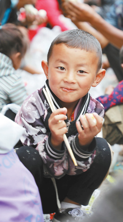 四川冕寧縣發(fā)生特大暴雨災害,武警涼山支隊官兵在多個安置點開展提供熱食、消毒防疫、巡診送藥和心理疏導等工作。圖為6月29日,一男孩在大馬烏村安置點吃早餐。