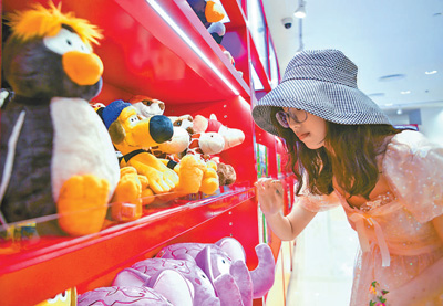 7月1日,海口日月廣場(chǎng)免稅店內(nèi),顧客正在選購(gòu)毛絨玩具。