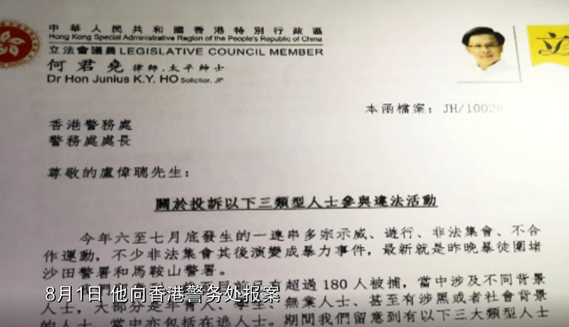 8月1日,他向香港警務處報案,呼吁警方果斷行動,拘捕參與違法活動的立法會議員。外籍人士和所有違法分子。