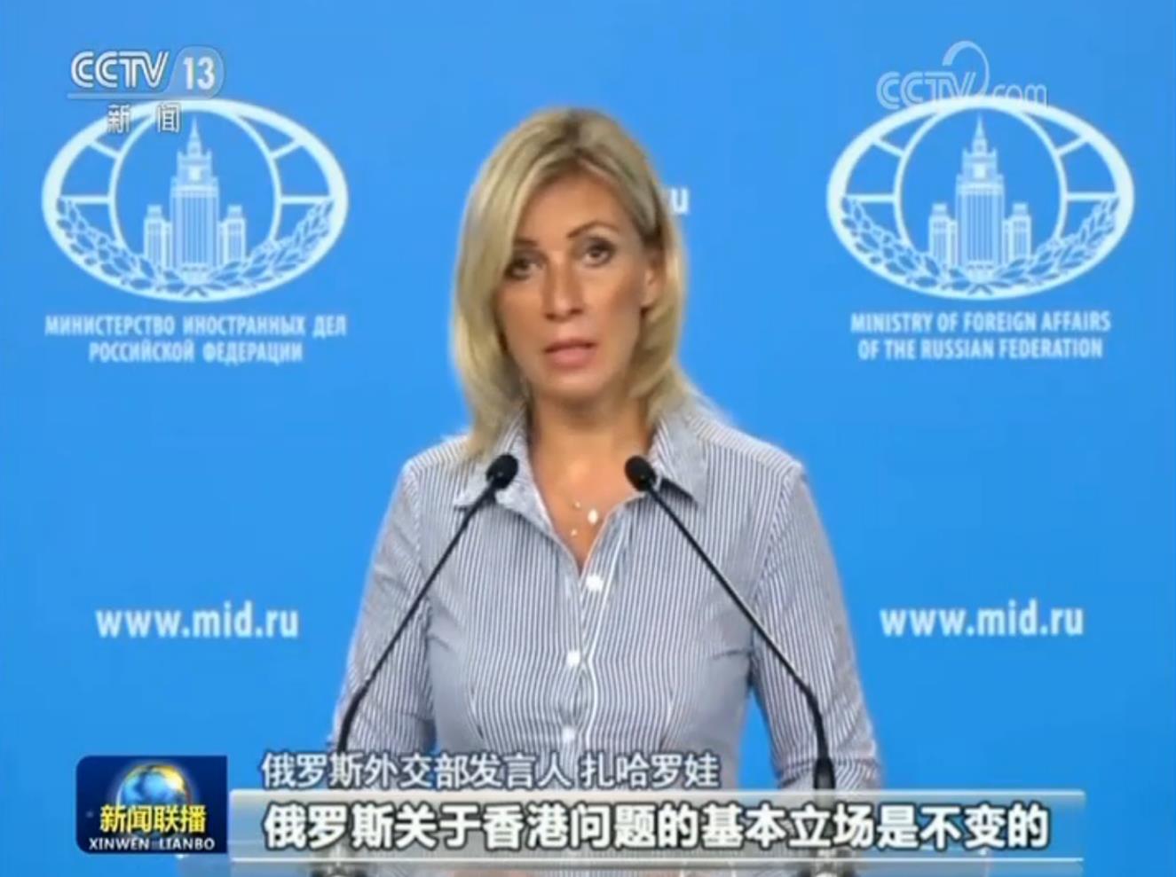 俄羅斯外交部發(fā)言人 扎哈羅娃:我想申明俄羅斯關(guān)于香港問題的基本立場是不變的,我們尊重中國主權(quán)和領(lǐng)土完整。與香港有關(guān)的一切事務(wù)都是中國的內(nèi)政,我們反對(duì)任何外國勢(shì)力干涉中國中央政府和特別行政區(qū)之間的事務(wù)。