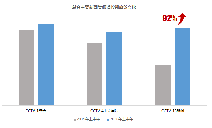 CCTV-新聞?lì)l道收視率增幅超過92%,較去年同期收視幾乎翻番。此外,總臺(tái)另外兩個(gè)新聞綜合類頻道CCTV-1綜合頻道收視率增長(zhǎng)8%、CCTV-4中文國際頻道收視率增長(zhǎng)16.6%。