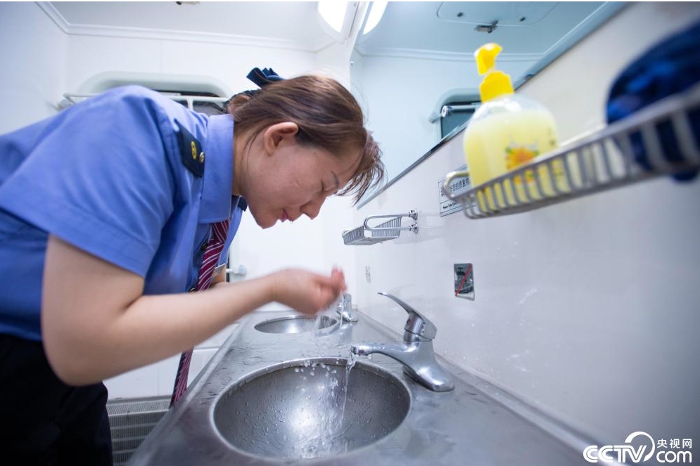 巡檢完畢,李卿茹才走到洗臉間,擰開水龍頭洗把臉,“與其說熱,倒不如說悶,因為完全沒有風也沒有空調(diào),列車還在太陽下暴曬!崩钋淙阏f,雖然每次值守需要在這樣的環(huán)境下工作近8個小時,但是三年下來自己已經(jīng)完全習慣了。(賈翔)