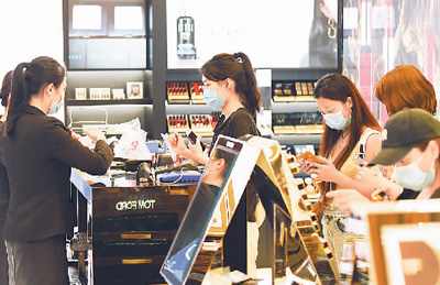 海關(guān)總署數(shù)據(jù)顯示,7月1日至7日海南離島免稅新政實(shí)施第一周內(nèi),離島旅客累計購物4.5億元,免稅6571萬元,日均免稅939萬元,比上半年日均增長58.2%。圖為7月12日,游客在?谌赵聫V場免稅店選購化妝品。