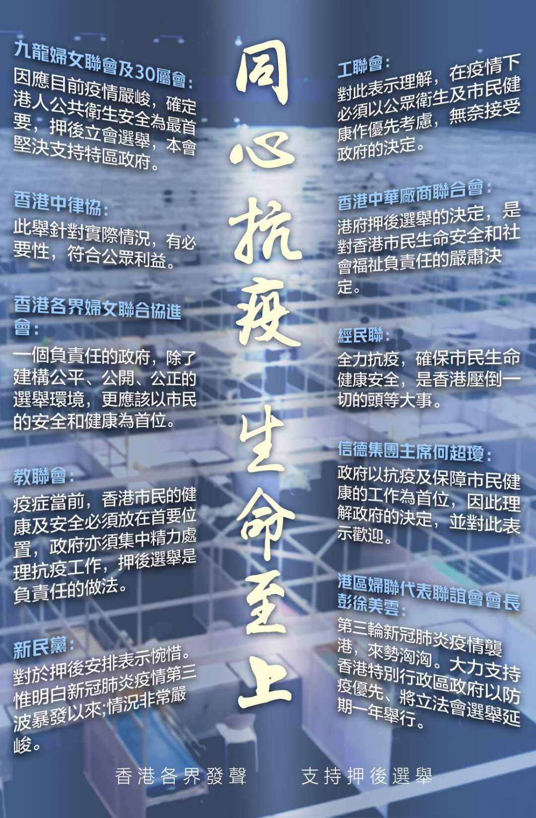 香港醫(yī)務(wù)委員會執(zhí)照醫(yī)生協(xié)會等15個(gè)醫(yī)學(xué)組織在聲明中指出,“若幾百萬人聚集在投票站投票”,無疑是“置市民性命于水火”。香港教育工作者聯(lián)會發(fā)聲,“疫癥當(dāng)前,押后選舉是負(fù)責(zé)任的做法。”香港各界婦女聯(lián)合協(xié)進(jìn)會表示:“一個(gè)負(fù)責(zé)任的政府,除了建構(gòu)公平、公正、公開的選舉環(huán)境,更應(yīng)該以市民的安全和健康為首位!薄叭劭挂哌B線”昨日發(fā)起的支持依法押后選舉的聯(lián)署,目前已有超過43萬人參與。顯然,特區(qū)政府的“艱難決定”贏得了大多數(shù)香港民眾的理解與支持。