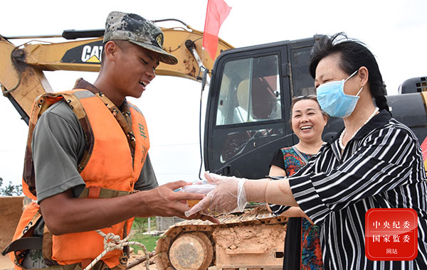“每次吃到熱騰騰的面條、包子和饅頭我就特別想念家里的媽媽,所以我們都喊她江媽媽!币幻00后小戰(zhàn)士說(shuō),江秀花這些天一直在圩堤上守著他們,經(jīng)常遞上毛巾、水,還會(huì)定時(shí)送好吃的和防暑藥品。而說(shuō)起子弟兵們,江秀花卻滿是心疼:“他們不是鐵人,都和我孩子差不多大,沒日沒夜地泡在水里高強(qiáng)度工作,我們得保證他們吃上熱乎飯喝上干凈水!