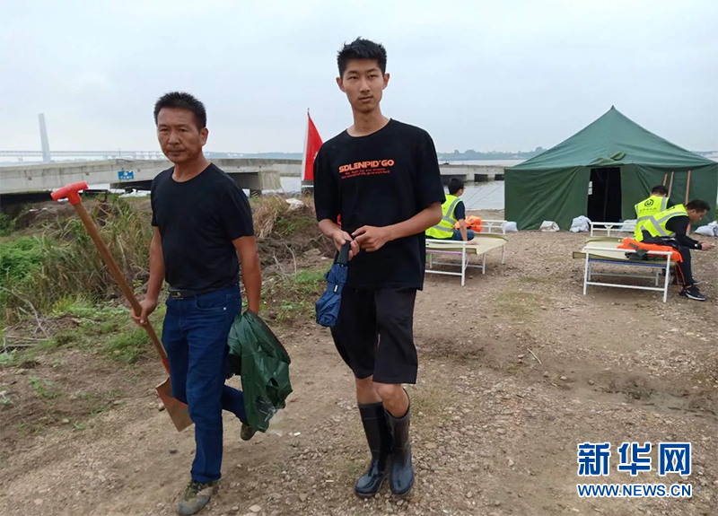 大學(xué)生王洪(右一)和父親一起出發(fā)巡守大堤。新華網(wǎng)發(fā)