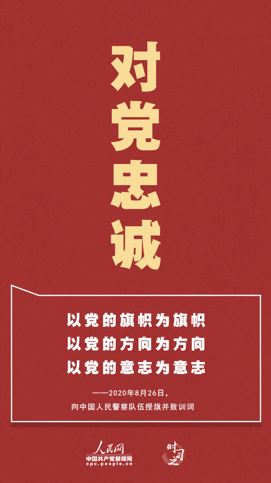 對黨忠誠——“堅定的理想信念是政法隊伍的政治靈魂!奔t色,是中國人民警察警旗的主色調(diào),也是忠誠的顏色。對黨忠誠、聽黨指揮,是人民警察隊伍代代相傳的政治基因。新時代,人民警察隊伍要堅持黨的絕對領(lǐng)導(dǎo),增強(qiáng)“四個意識”、堅定“四個自信”、做到“兩個維護(hù)”,確保絕對忠誠、絕對純潔、絕對可靠。