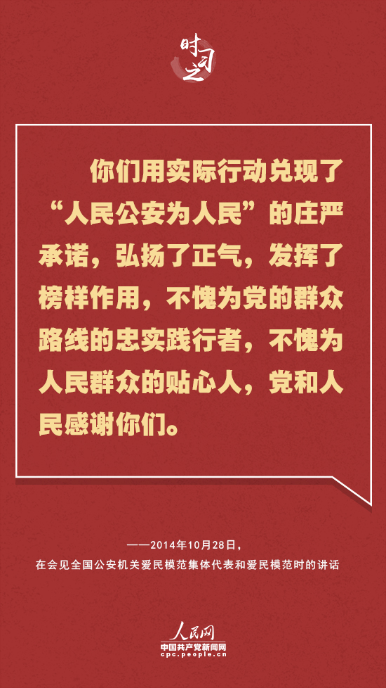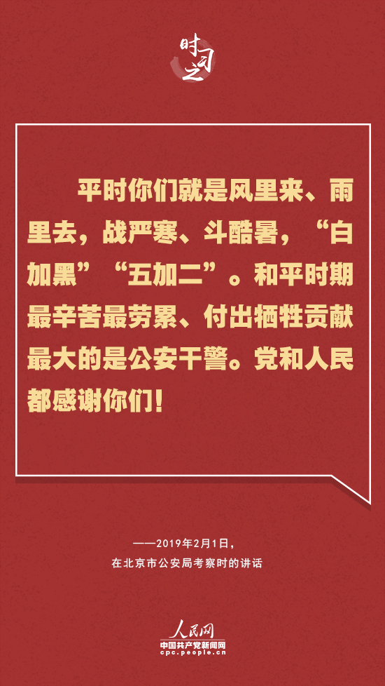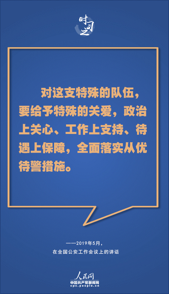 對人民警察這支和平時期“犧牲最多、奉獻(xiàn)最大”的特殊隊伍,習(xí)近平多次表達(dá)感謝——“你們用實際行動兌現(xiàn)了‘人民公安為人民’的莊嚴(yán)承諾,弘揚(yáng)了正氣,發(fā)揮了榜樣作用,不愧為黨的群眾路線的忠實踐行者,不愧為人民群眾的貼心人,黨和人民感謝你們!薄罢怯辛四銈兊男燎诟冻龊土餮獱奚,才換來了廣大人民群眾的安寧和幸福。你們不愧為黨和人民的忠誠衛(wèi)士,黨和人民感謝你們!薄捌綍r你們就是風(fēng)里來、雨里去,戰(zhàn)嚴(yán)寒、斗酷暑,‘白加黑’‘五加二’。和平時期最辛苦最勞累、付出犧牲貢獻(xiàn)最大的是公安干警。黨和人民都感謝你們!”
