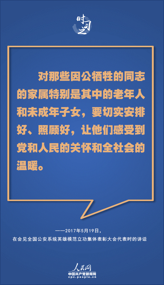 “這些年來,每當(dāng)看到公安民警舍生忘死、感人肺腑的事跡,我都深受感動;每當(dāng)聽到公安民警在血與火、生與死的考驗面前赴湯蹈火、流血犧牲的消息,我都深感心痛!2017年5月19日,習(xí)近平在會見全國公安系統(tǒng)英雄模范立功集體表彰大會代表時指出,廣大公安英雄模范身上體現(xiàn)的忠誠信念、擔(dān)當(dāng)精神、英雄氣概,是中華民族偉大精神的真實寫照。