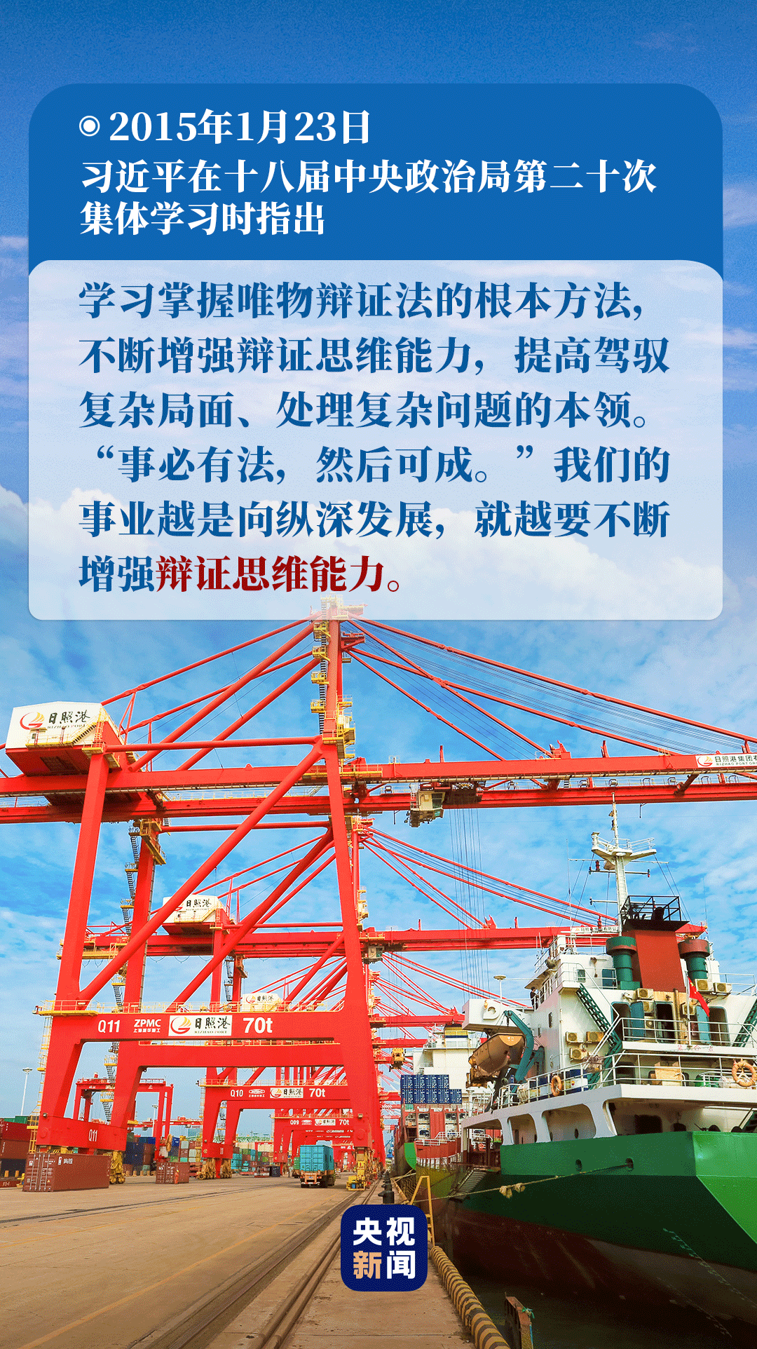 “要堅持發(fā)展地而不是靜止地、全面地而不是片面地、系統(tǒng)地而不是零散地、普遍聯(lián)系地而不是單一孤立地觀察事物,妥善處理各種重大關(guān)系。”2015年1月23日,習(xí)近平在十八屆中央政治局第二十次集體學(xué)習(xí)時的講話中,對如何在實(shí)際工作中運(yùn)用唯物辯證法,作出了深刻闡述。