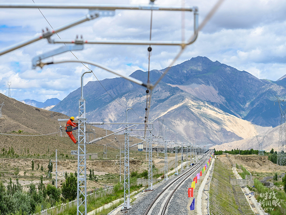 △施工人員對拉林鐵路(川藏鐵路拉薩至林芝段)沿線上空架設的供電線路進行復檢。拉林鐵路是西藏首條電氣化鐵路,正線全長435.48公里。