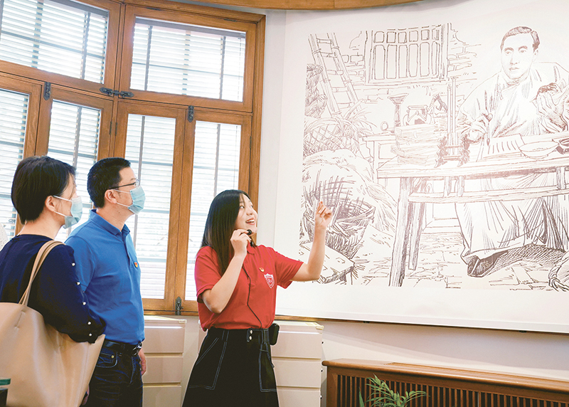 2018年5月,復旦大學將陳望道故居改造為《共產黨宣言》展示館,該校一批青年教師和學生組建黨員志愿服務隊,面向廣大師生和社會各界開展宣講活動。2020年6月,他們中的30名隊員給習近平總書記寫信,表達了做《共產黨宣言》精神忠實傳人的信心和決心。習近平總書記在回信中勉勵他們繼續(xù)講好關于理想信念的故事,并對全國廣大黨員特別是青年黨員提出殷切期望。圖為黨員志愿服務隊隊員在為觀眾講解。 新華社記者 劉穎/攝