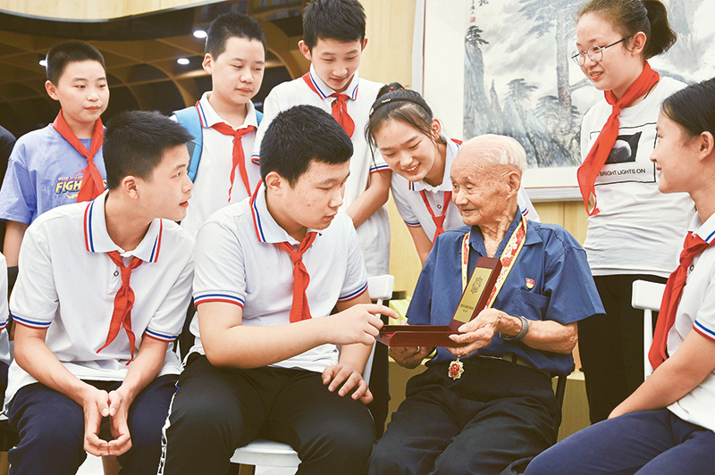 2020年8月23日,安徽省合肥市薛河灣社區(qū)舉行“聽老兵講故事”愛國主義主題教育活動,少先隊員們聆聽老兵講述抗戰(zhàn)故事,銘記戰(zhàn)爭的苦難與勝利的光榮。圖為學生們在聽九旬老兵施長明講自己當年的戰(zhàn)斗故事。中新社記者 韓蘇原/攝