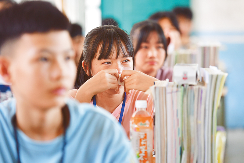 2019年9月,西北工業(yè)大學派出支教團到廣西融水苗族自治縣部分中學支教。近一年來,支教團成員積極創(chuàng)新教學方法,強化教學技能,深受老師認可和同學喜愛。2020年7月23日,融水苗族自治縣;钢袑W1813班為支教老師舉辦送別班會,一名同學流下不舍的淚水。 新華社記者 黃孝邦/攝