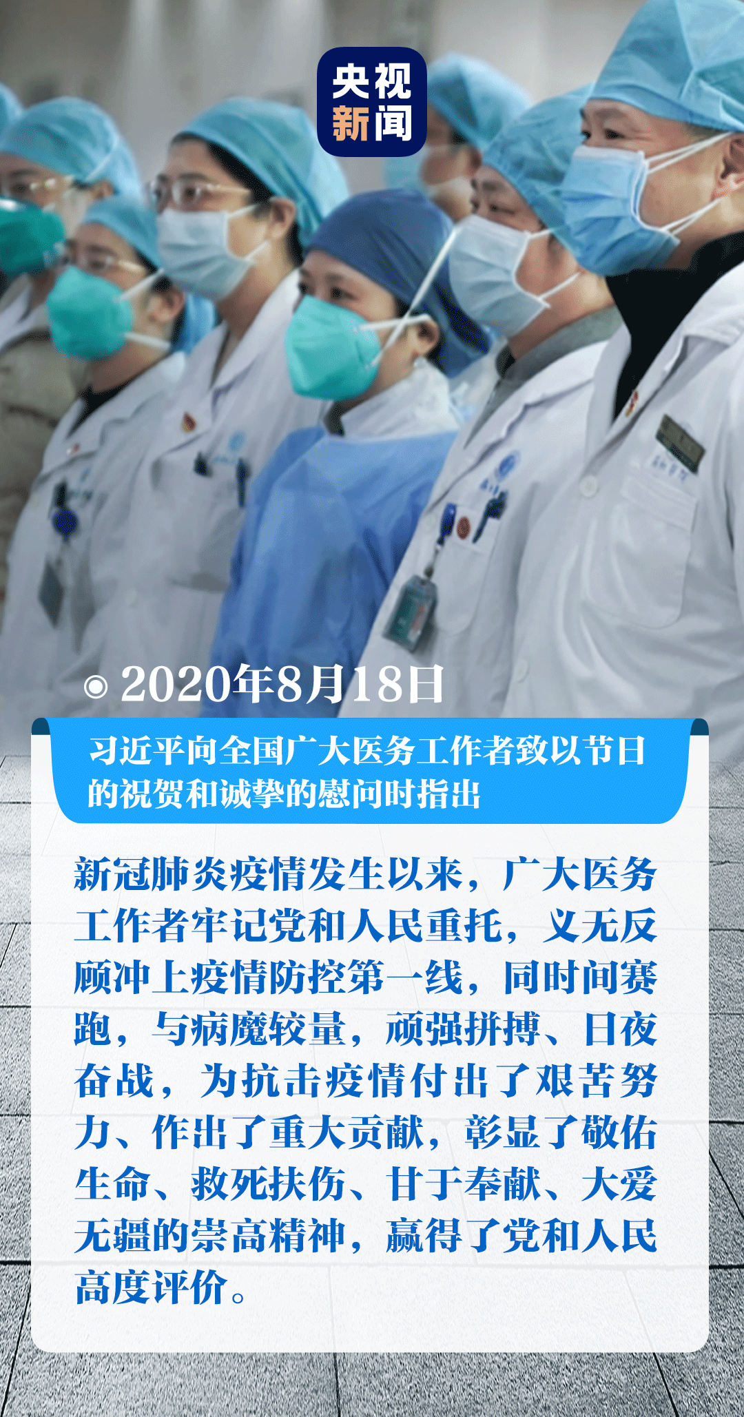 在抗擊新冠肺炎疫情戰(zhàn)場上,同樣值得被稱贊的,還有廣大醫(yī)務(wù)工作者。8月18日,在第三個中國醫(yī)師節(jié)到來之際,習近平代表黨中央,向全國廣大醫(yī)務(wù)工作者致以節(jié)日的祝賀和誠摯的慰問。