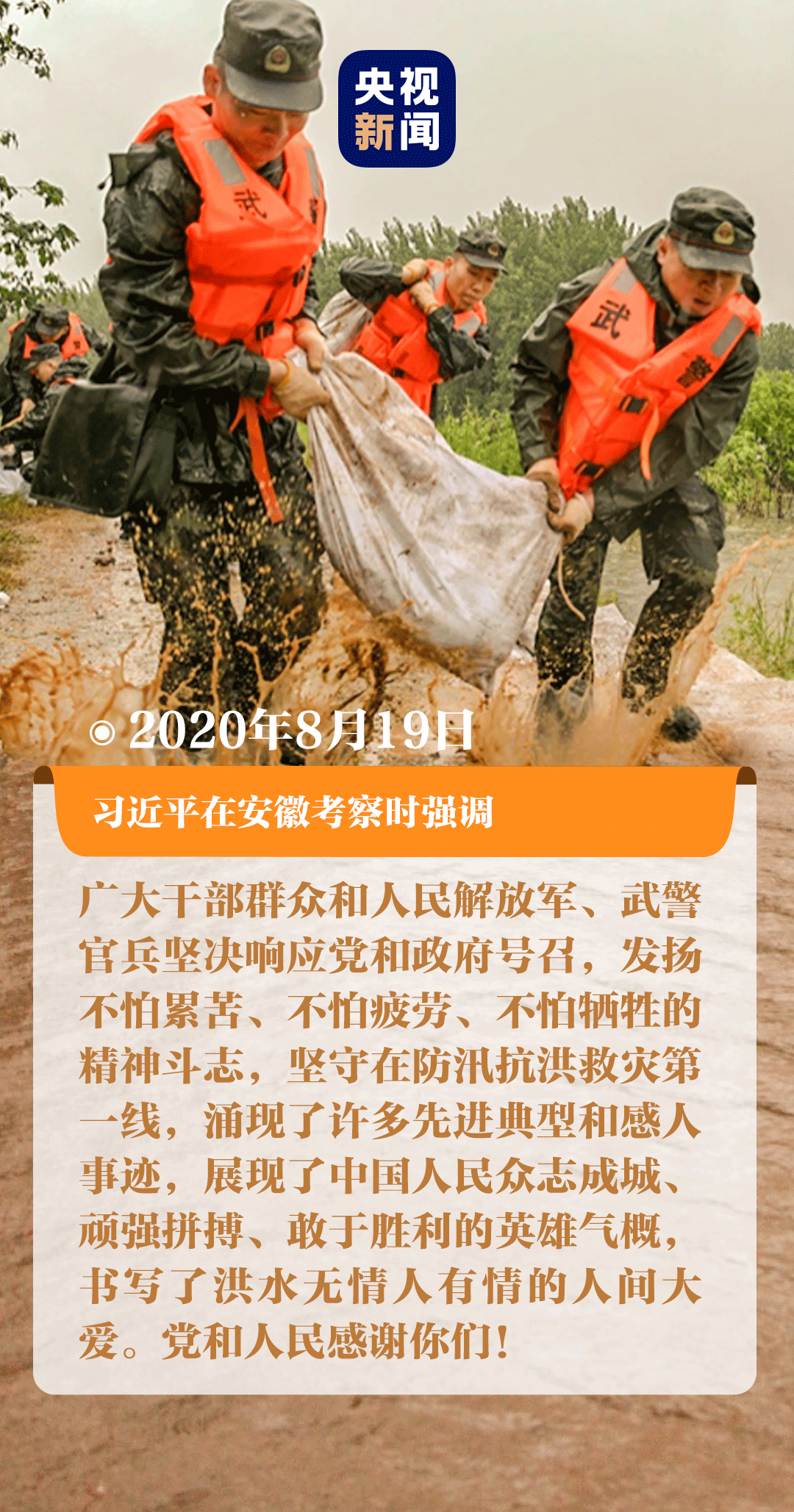 人民軍隊聽黨指揮、聞令而動、向險而行。截至8月19日,人民解放軍和武警部隊共參加了17個省份的防汛救災(zāi)行動:17萬余人被安全轉(zhuǎn)移、3900多處決口和管涌被封堵;900多公里堤壩被加固、350多公里道路被搶通……