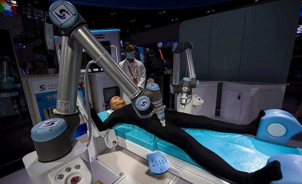 △2020年服貿(mào)會綜合展區(qū),參觀者正在體驗中醫(yī)智能經(jīng)絡(luò)導引機器人。