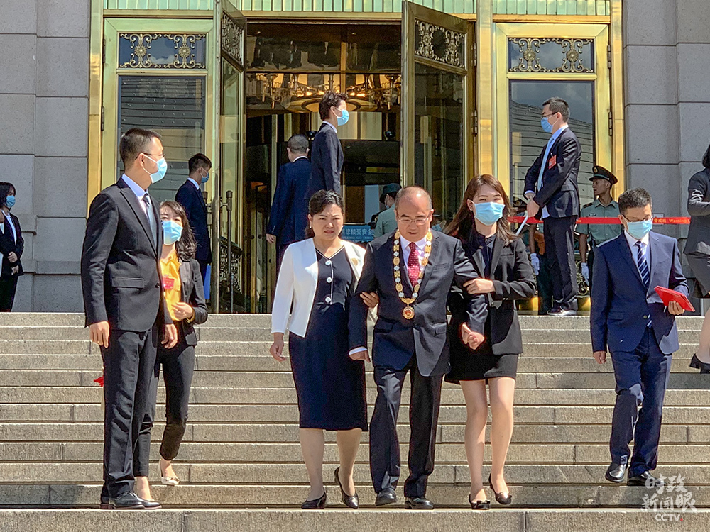 △表彰大會結(jié)束后,患有漸凍癥、行走不便的張定宇被攙扶著走出大會堂。(總臺央視記者王志明拍攝)