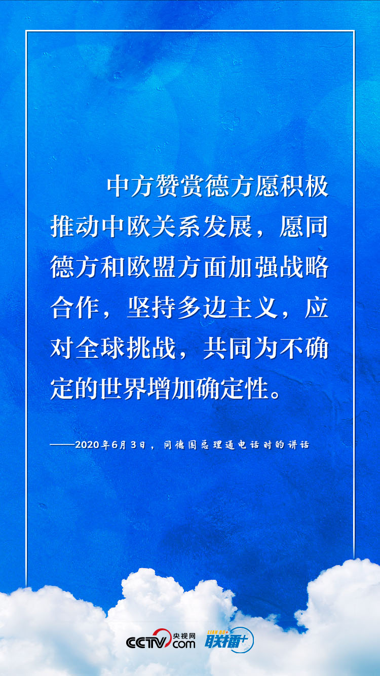9月14日,習(xí)近平主席將以視頻方式同德國(guó)總理默克爾、歐洲理事會(huì)主席米歇爾、歐盟委員會(huì)主席馮德萊恩共同舉行中德歐領(lǐng)導(dǎo)人會(huì)晤!堵(lián)播+》梳理今年以來(lái)習(xí)近平主席與德國(guó)、歐盟領(lǐng)導(dǎo)人“云外交”的部分講話,與您共同感受團(tuán)結(jié)合作中蘊(yùn)藏的深遠(yuǎn)意義。