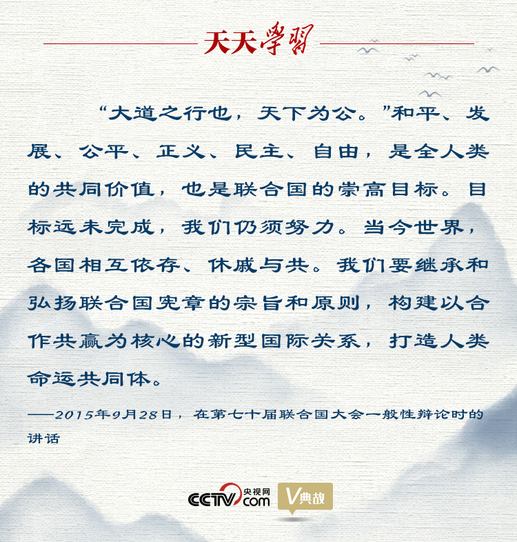 2015年9月28日,在第七十屆聯(lián)合國大會一般性辯論時的講話中,習(xí)近平主席用中國儒家的“天下為公”思想闡述人類命運共同體的理念——
