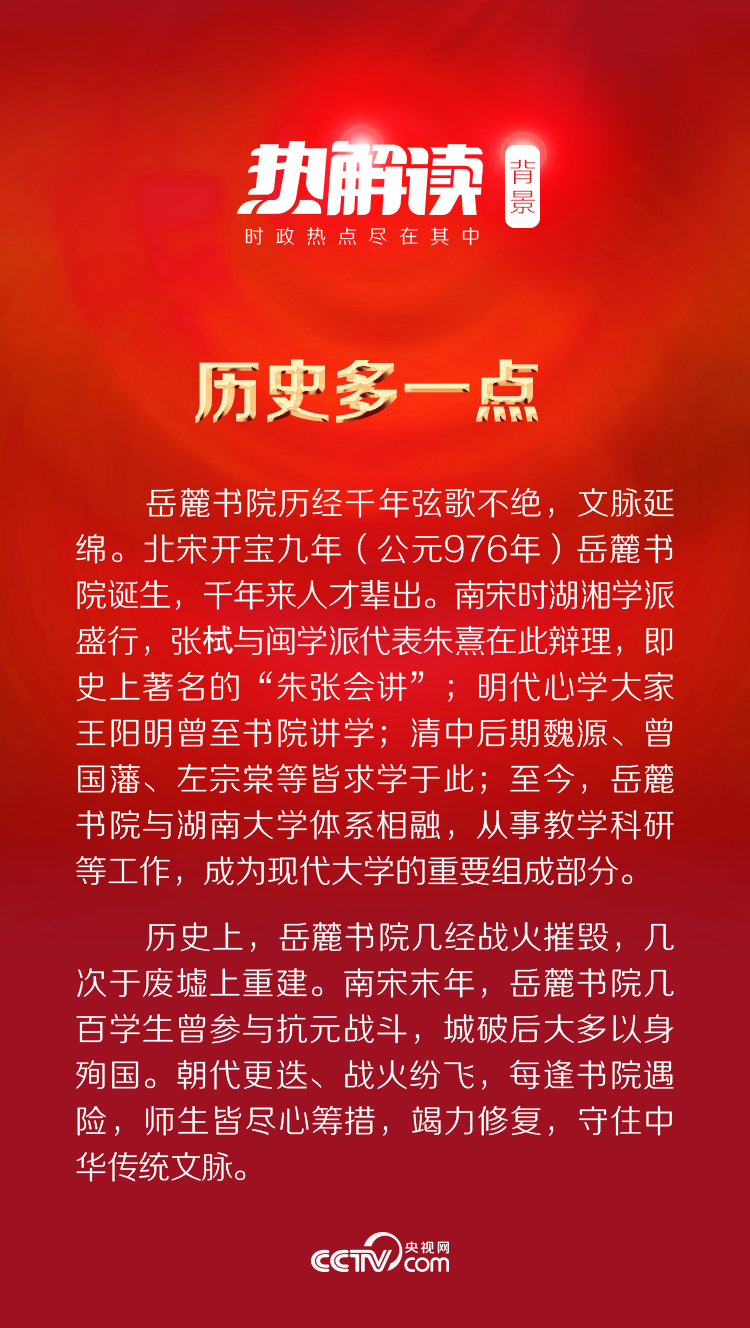 離開校園時(shí),習(xí)近平總書記深情地對(duì)師生們說(shuō):“岳麓書院一直是我有牽掛,這個(gè)學(xué)院在我們的傳統(tǒng)文化中的地位、影響,我還是很有感觸的!笨倳浱貏e剖析了“惟楚有材,于斯為盛”這副古聯(lián)背后的深意:“于斯為盛,我的體會(huì)一個(gè)就是我們湖南人才濟(jì)濟(jì),代有才人出啊,有報(bào)效祖國(guó)的棟梁之材。再有呢,于斯為盛這個(gè)‘斯’,是指的這個(gè)時(shí)代。明年是第十四個(gè)‘五年規(guī)劃’開局之年,是我們開啟‘第二個(gè)百年’新征程的起點(diǎn)。這是一個(gè)英雄輩出的時(shí)代,你們這個(gè)年紀(jì)正當(dāng)其時(shí)!