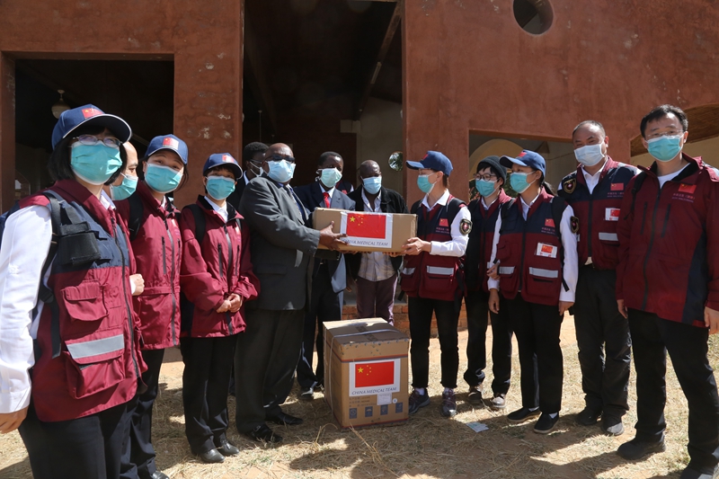 在津巴布韋中馬紹納蘭省的姆武爾維醫(yī)院,中國(guó)抗疫醫(yī)療專家組為當(dāng)?shù)蒯t(yī)療機(jī)構(gòu)捐贈(zèng)醫(yī)療物資(5月19日攝)。新華社記者 張玉亮 攝