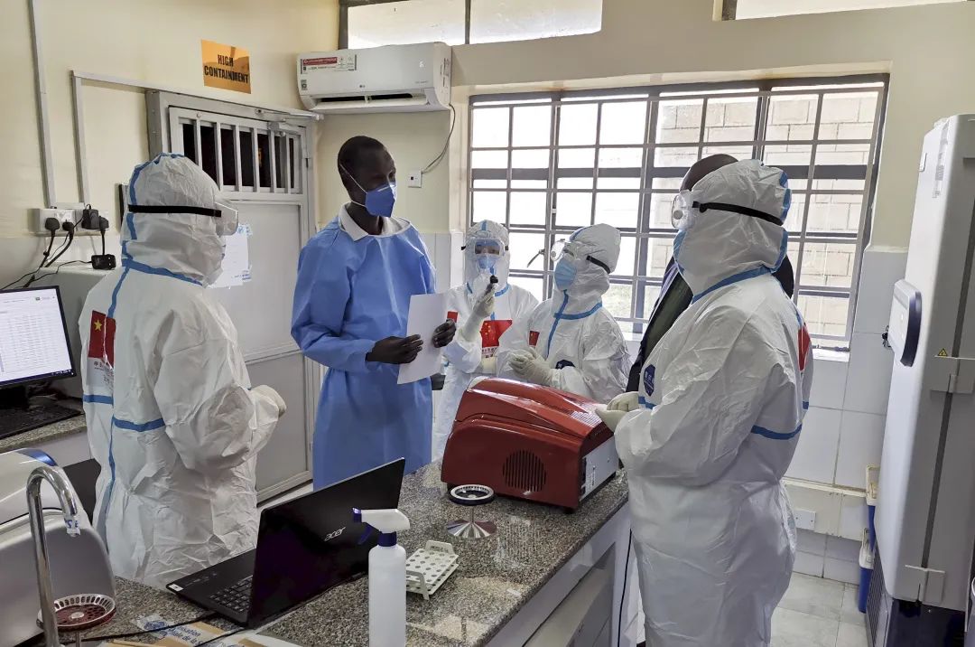 在南蘇丹首都朱巴的一處新冠病毒檢測機構(gòu),中國抗疫醫(yī)療專家組成員與南一線醫(yī)護人員交流(8月21日攝)。新華社發(fā)(中國駐南蘇丹大使館供圖)