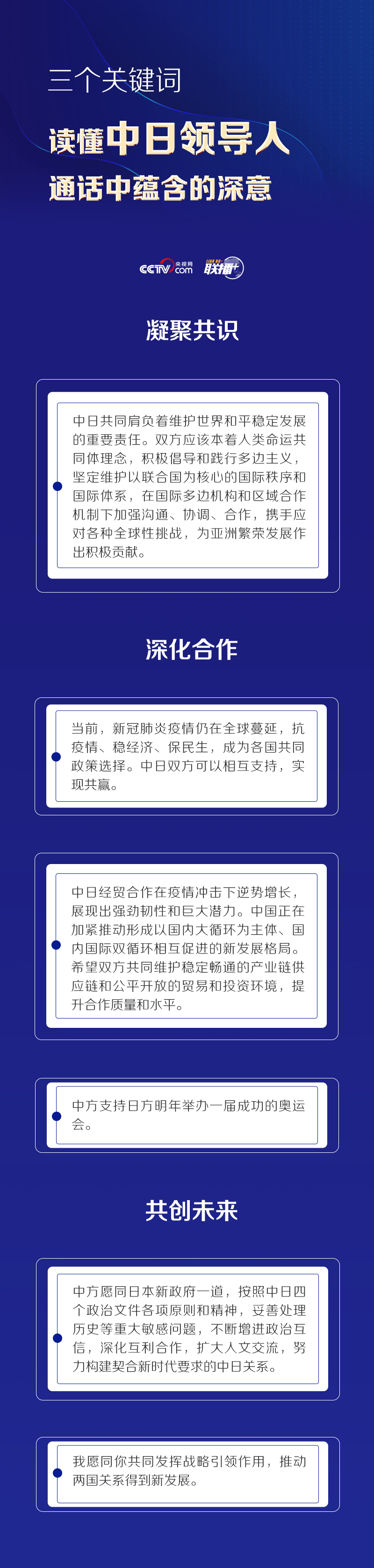 9月25日晚,習近平主席同日本首相菅義偉通電話。通話中,兩國領導人就中日關系、深化各領域合作等話題進行交流。具體通話內(nèi)容,央視網(wǎng)《聯(lián)播+》為您梳理。