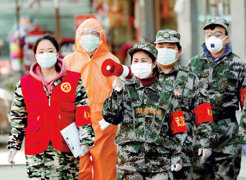 疫情防控阻擊戰(zhàn)打響后,湖北省武漢市江岸區(qū)人武部每天組織300多名民兵24小時(shí)值守在全區(qū)17個(gè)街道52個(gè)疫情防控值勤點(diǎn)崗位,宣傳新冠肺炎疫情防控、測(cè)量體溫、排查登記居民信息,為居民送菜代購生活物資和藥品、為社區(qū)居民守好健康之門,筑起疫情防控的銅墻鐵壁。圖為2020年2月20日,江岸區(qū)人武部組織民兵在后湖南街建設(shè)新村社區(qū)宣傳疫情防控。 湖北日?qǐng)?bào)記者 張鴻/攝