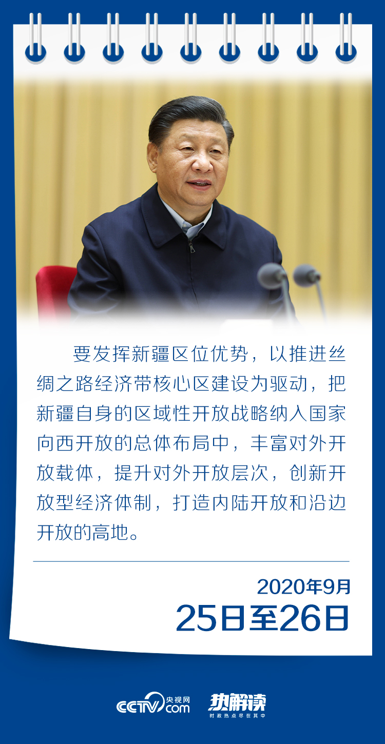 總書記說,要發(fā)揮新疆區(qū)位優(yōu)勢,以推進(jìn)絲綢之路經(jīng)濟(jì)帶核心區(qū)建設(shè)為驅(qū)動(dòng),把新疆自身的區(qū)域性開放戰(zhàn)略納入國家向西開放的總體布局中,豐富對外開放載體,提升對外開放層次,創(chuàng)新開放型經(jīng)濟(jì)體制,打造內(nèi)陸開放和沿邊開放的高地。