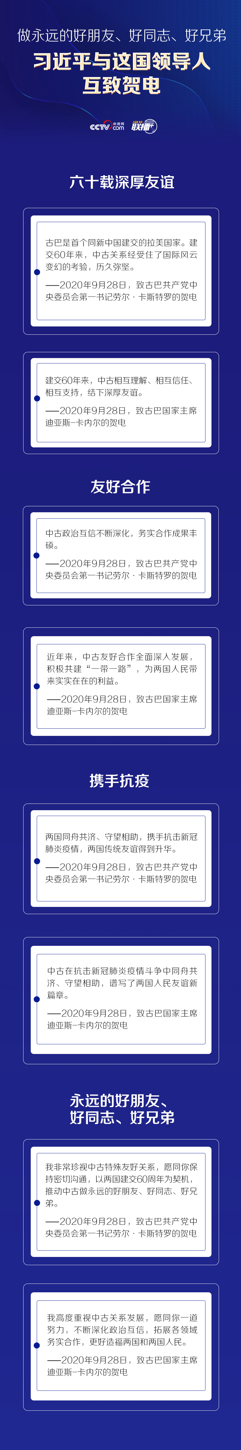 9月28日,中共中央總書(shū)記、國(guó)家主席習(xí)近平分別同古巴共產(chǎn)黨中央委員會(huì)第一書(shū)記勞爾·卡斯特羅、古巴國(guó)家主席迪亞斯-卡內(nèi)爾互致賀電,熱烈慶祝兩國(guó)建交60周年。
