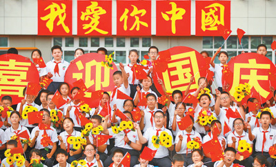 江蘇揚(yáng)州文津中學(xué)學(xué)生唱國(guó)歌、學(xué)國(guó)旗知識(shí),喜迎國(guó)慶。