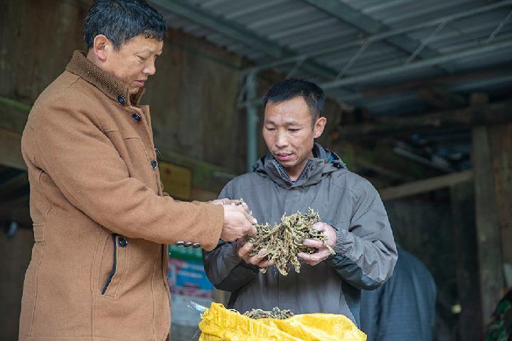↑在重慶市南川區(qū)山王坪鎮(zhèn)廟壩村,村民張廷剛(右)跟藥販一起檢查出售的黃連品質(zhì)(9月28日攝)。