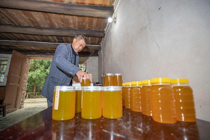 ↑在重慶市南川區(qū)山王坪鎮(zhèn)廟壩村,村民夏春學(xué)在包裝蜂蜜(9月28日攝)。