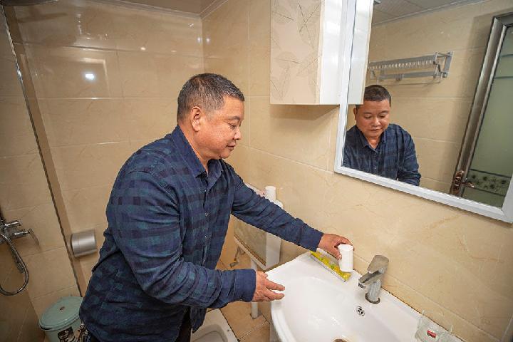 ↑在重慶市南川區(qū)山王坪鎮(zhèn)廟壩村,村民程坤詳檢查整理自家經(jīng)營(yíng)的民宿房間,提前為國(guó)慶小長(zhǎng)假接待游客做準(zhǔn)備(9月28日攝)。