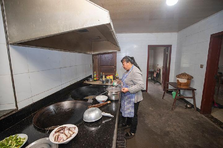 ↑在重慶市南川區(qū)山王坪鎮(zhèn)廟壩村,村民鄭洪琴在自家經(jīng)營(yíng)的農(nóng)家樂內(nèi)為游客做飯(9月28日攝)。