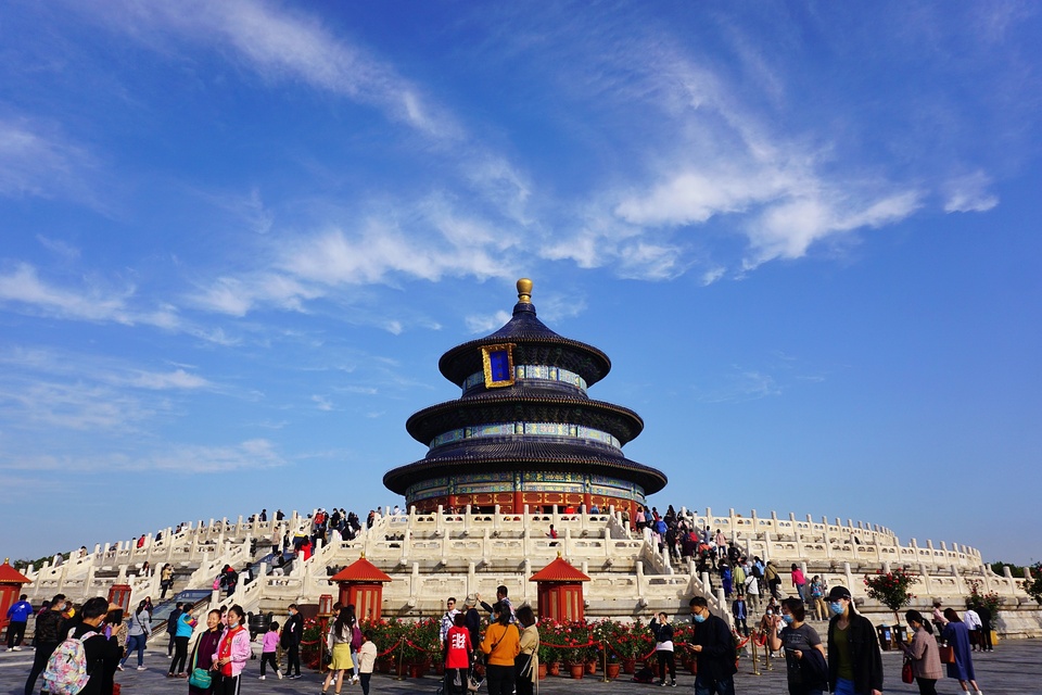 2020年10月3日,北京秋高氣爽,天壇公園祈年殿在藍(lán)天白云映襯下更顯壯觀。