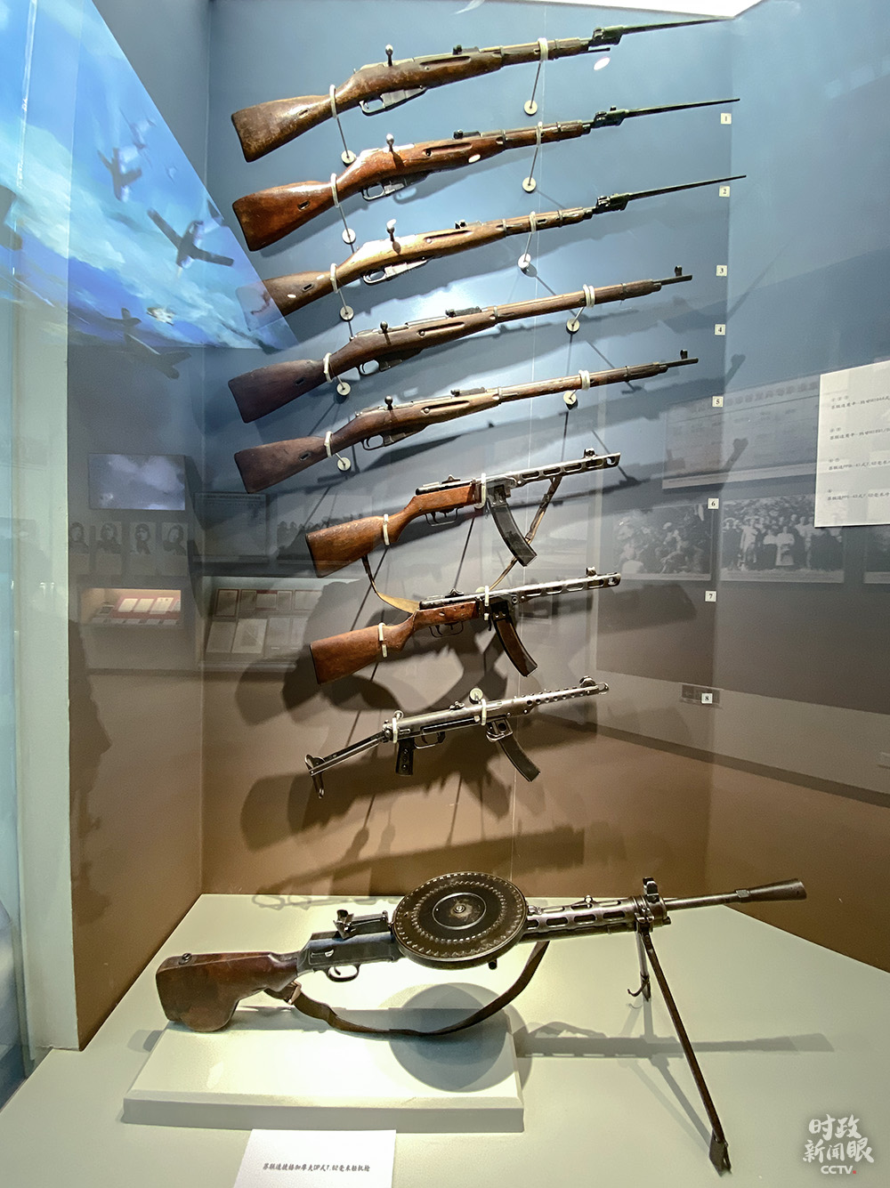 △圖中最下面是捷格加廖夫輕機(jī)槍,彈盤(pán)裝彈數(shù)量多?姑涝瘧(zhàn)場(chǎng)上,志愿軍曾使用過(guò)這種火力兇猛的蘇式機(jī)槍。(總臺(tái)央視記者李輝拍攝)