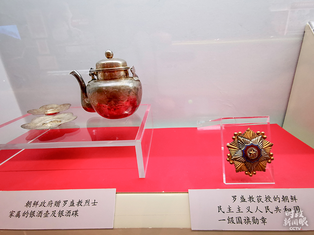 △左為朝鮮政府贈(zèng)給羅盛教烈士家屬的銀酒壺、銀酒碟,右為羅盛教獲授的朝鮮民主主義人民共和國(guó)一級(jí)國(guó)旗勛章。(總臺(tái)央視記者荊偉拍攝)