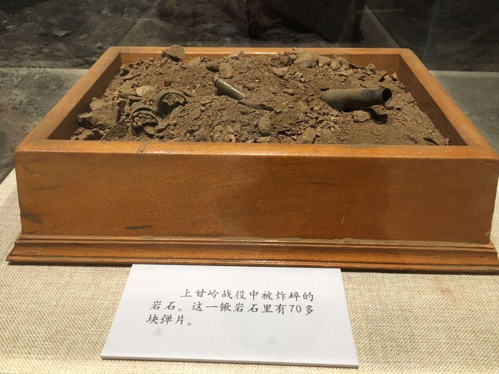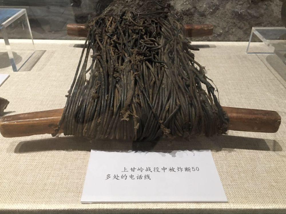 在軍博的主題展覽“血戰(zhàn)上甘嶺”展區(qū),幾件戰(zhàn)場(chǎng)實(shí)物似乎還能讓人聞到當(dāng)年的殘酷硝煙:一截嵌滿(mǎn)彈片的枯樹(shù)干,一堆摻雜著彈片的碎石焦土,被炸斷50多處的200多米電話(huà)線(xiàn)……