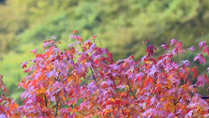 山頭枝丫間那一簇簇、一片片紅葉,綠樹紅葉交相輝映,如紅瑪瑙墜入翡翠之中,仿若一幅美麗畫卷。