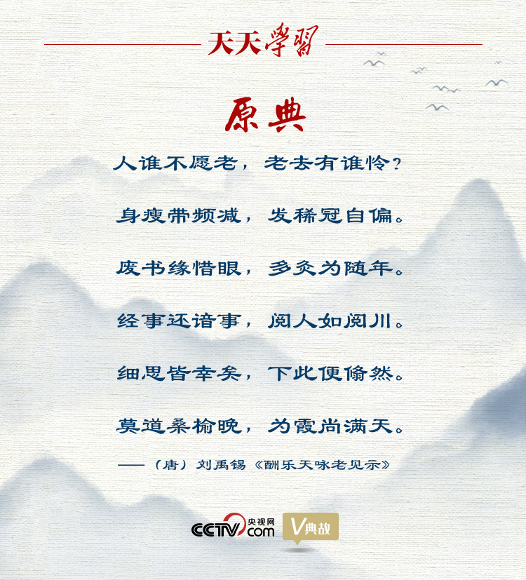 “莫道桑榆晚,為霞尚滿天!2014年11月26日,習(xí)近平總書記在會見全國離退休干部先進(jìn)集體和先進(jìn)個人代表時,用劉禹錫的詩句鼓勵廣大老同志繼續(xù)發(fā)揮余熱,作出積極貢獻(xiàn)。