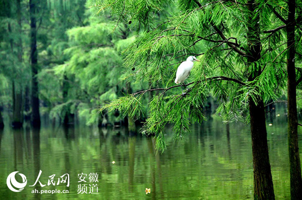 置身于滁州市來安縣雷官鎮(zhèn)的池杉湖濕地公園,一株株蒼翠的池杉矗立水中,偉岸挺拔,鳥兒或站立枝頭,或群起盤旋,三三兩兩的游客漫步于水邊的觀景步道,一派人與自然和諧相處的景象。