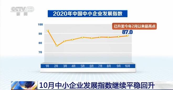 央視網(wǎng)消息:中國中小企業(yè)協(xié)會昨天(10日)發(fā)布數(shù)據(jù)顯示,10月中國中小企業(yè)發(fā)展指數(shù)為87.0,比9月上升0.1個點,已升至今年2月以來最高點。