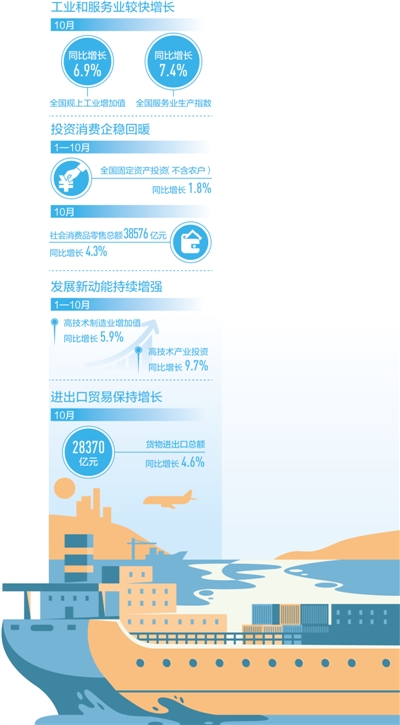 10月份,工業(yè)和服務(wù)業(yè)較快增長,投資消費企穩(wěn)回暖,生產(chǎn)要素趨于活躍,發(fā)展新動能持續(xù)增強(qiáng),經(jīng)濟(jì)運行延續(xù)穩(wěn)定恢復(fù)態(tài)勢。經(jīng)濟(jì)增長面在拓展,增長勢頭進(jìn)一步鞏固。展望下一階段,中國經(jīng)濟(jì)具有強(qiáng)大的韌性、修復(fù)能力和發(fā)展?jié)摿,有基礎(chǔ)有條件實現(xiàn)全年預(yù)期目標(biāo)。