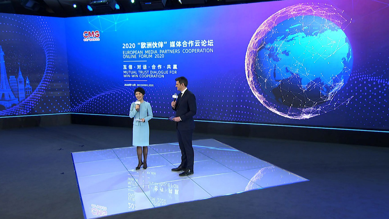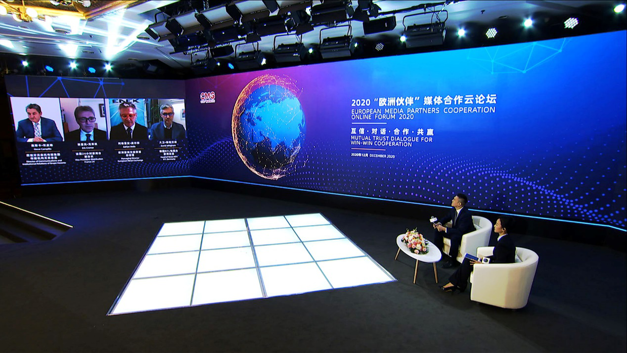 12月10日,中央廣播電視總臺(tái)以視頻連線的方式舉辦2020“歐洲伙伴”媒體合作云論壇。中宣部副部長(zhǎng)、中央廣播電視總臺(tái)臺(tái)長(zhǎng)、總編輯慎海雄出席并發(fā)表致辭,強(qiáng)調(diào)堅(jiān)持多邊主義,加強(qiáng)對(duì)話交流,構(gòu)建中歐媒體伙伴關(guān)系。中央廣播電視總臺(tái)相關(guān)代表與來(lái)自歐洲地區(qū)16個(gè)國(guó)家25家媒體機(jī)構(gòu)的28名與會(huì)代表圍繞“互信·對(duì)話·合作·共贏”主題,相聚云端展開對(duì)話,共同發(fā)布《加強(qiáng)媒體合作聯(lián)合聲明》,積極推動(dòng)中歐媒體加強(qiáng)合作、同舟共濟(jì)、團(tuán)結(jié)抗疫,提振國(guó)際社會(huì)信心。