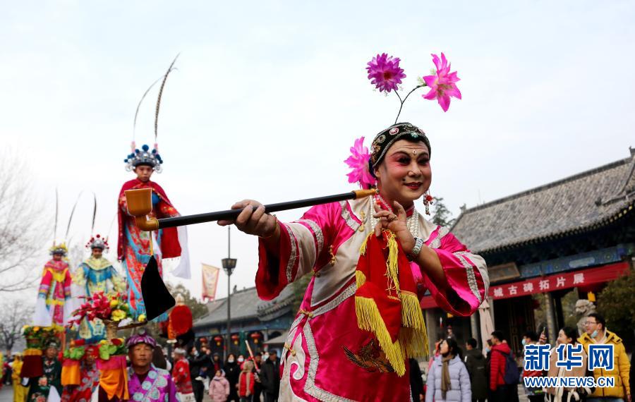 1月2日,游客在山東省棗莊市臺兒莊古城觀看社火巡游表演。