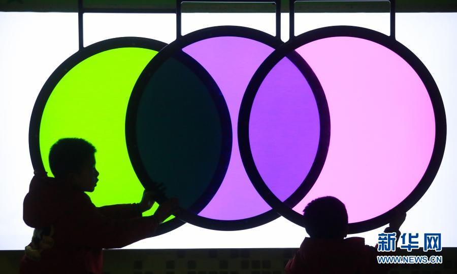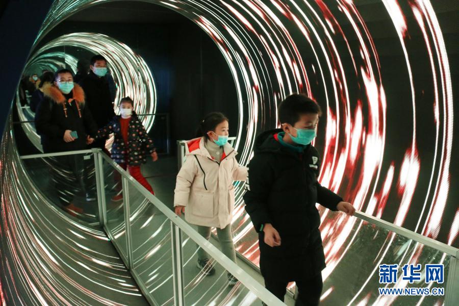 1月2日,孩子們在南京科技館通過“眩光通道”。