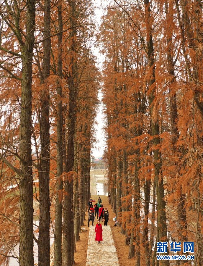 1月2日,游客在湖南省衡陽市雁峰區(qū)岳屏鎮(zhèn)隆橋村的水杉林游玩(無人機(jī)照片)。